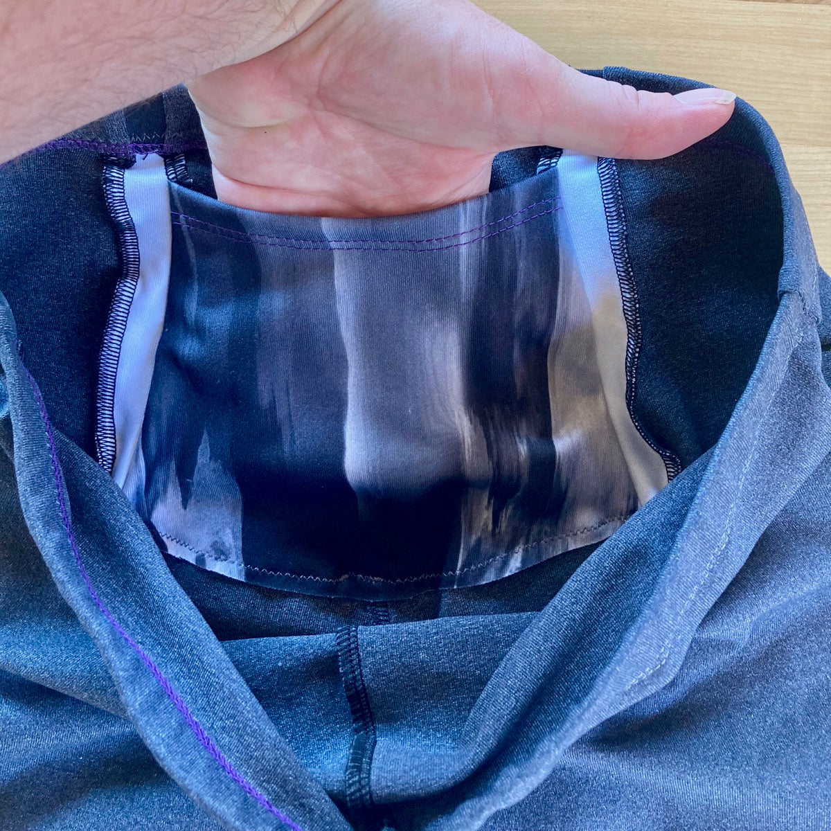 This is a digital sewing pattern for close-fitting, workout leggings with contrast swirl design on the upper front thigh leading to the upper back. There’s a hidden pocket inside at the upper centre back, perfect for gels, keys, or your phone, and contrast panels at the back of your knees are perfect for mesh fabrics. An elasticated, high-rise waistband means they won’t shift around as you move, either!