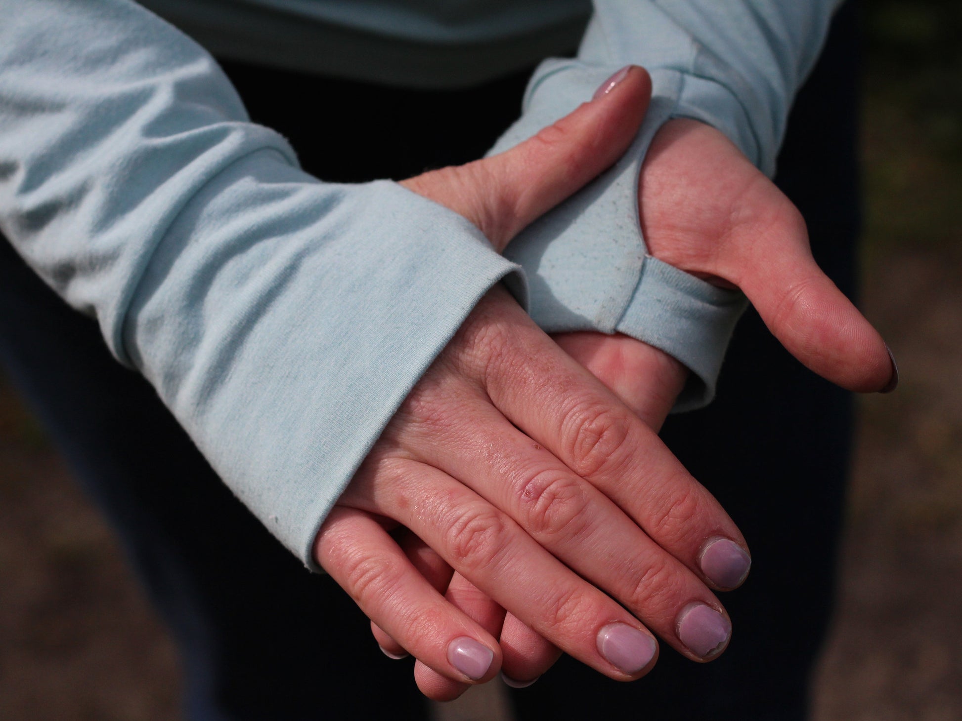 Note that the thumb cuffs here are interchangeable with the hand mitts from the Surf to Summit Top (Ladies) pattern, so you can swap them however you like.