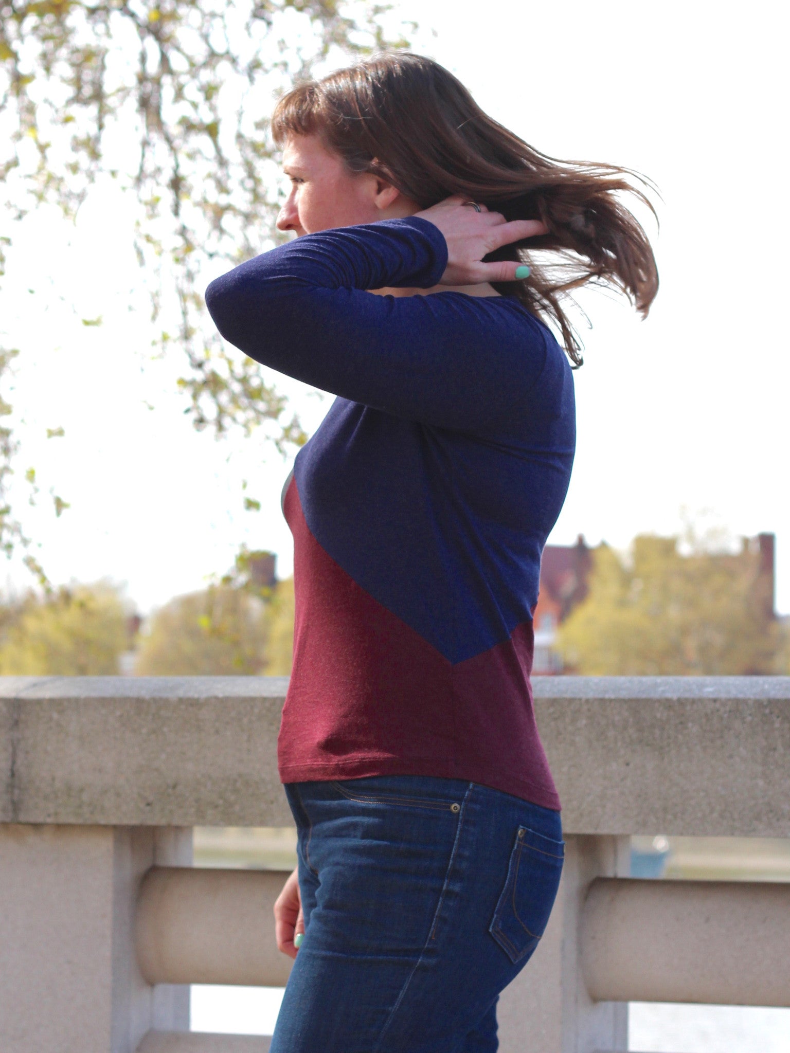 Sew a basic long- or short-sleeved teeshirt with banded neck and asymmetric seaming, or choose to add on thumb cuffs to the sleeves (without any hand sewing!), a hood with a special opening for your ponytail, or a zippered back pocket - perfect for cycling and hiking. Choose to add just one, or even all three features onto your teeshirt! Geometric seaming on the front and back makes this top perfect for colourblocking.
